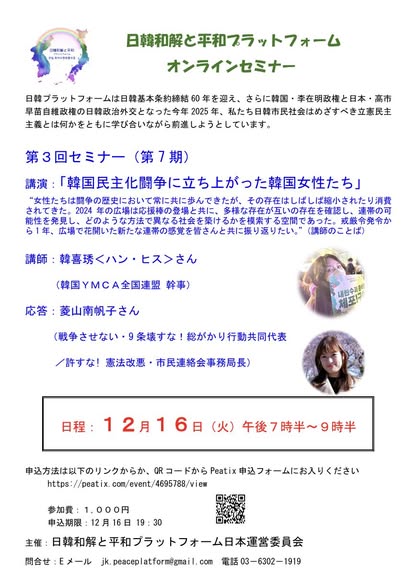 日韓和解と平和プラットフォームオンラインセミナーのご案内