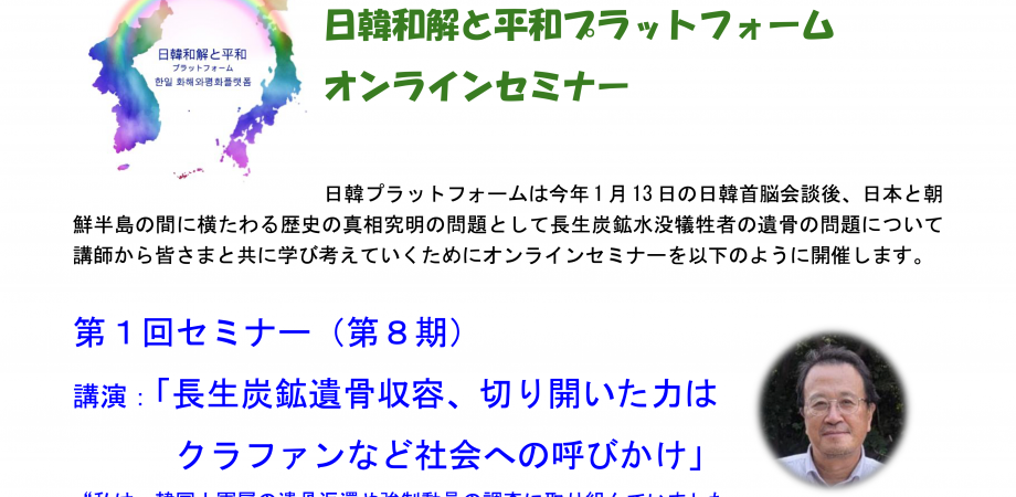日韓プラットフォームは今年1月13日の日韓首脳会談後、日本と朝鮮半島の間に横たわる歴史の真相究明の問題として長生炭鉱水没犠牲者の遺骨の問題について講師から皆さまと共に学び考えていくためにオンラインセミナーを以下のように開催します。
